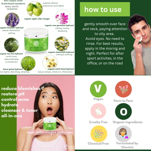 An exclusive non-comedogenic formula of Apple Cider Vinegar w/ the mother plus six acne-fighting hydrosols to help soothe blemishes, tone, brighten, clarify, balance pH. Our teens ask us for a simple formulation with no oils and with apple cider vinegar as a base. As a cancer survivor and working directly with our farmers, I choose each of the six best botanical hydrosols to bring you a super gentle, balancing and amazing All-In-One ACV face pads.